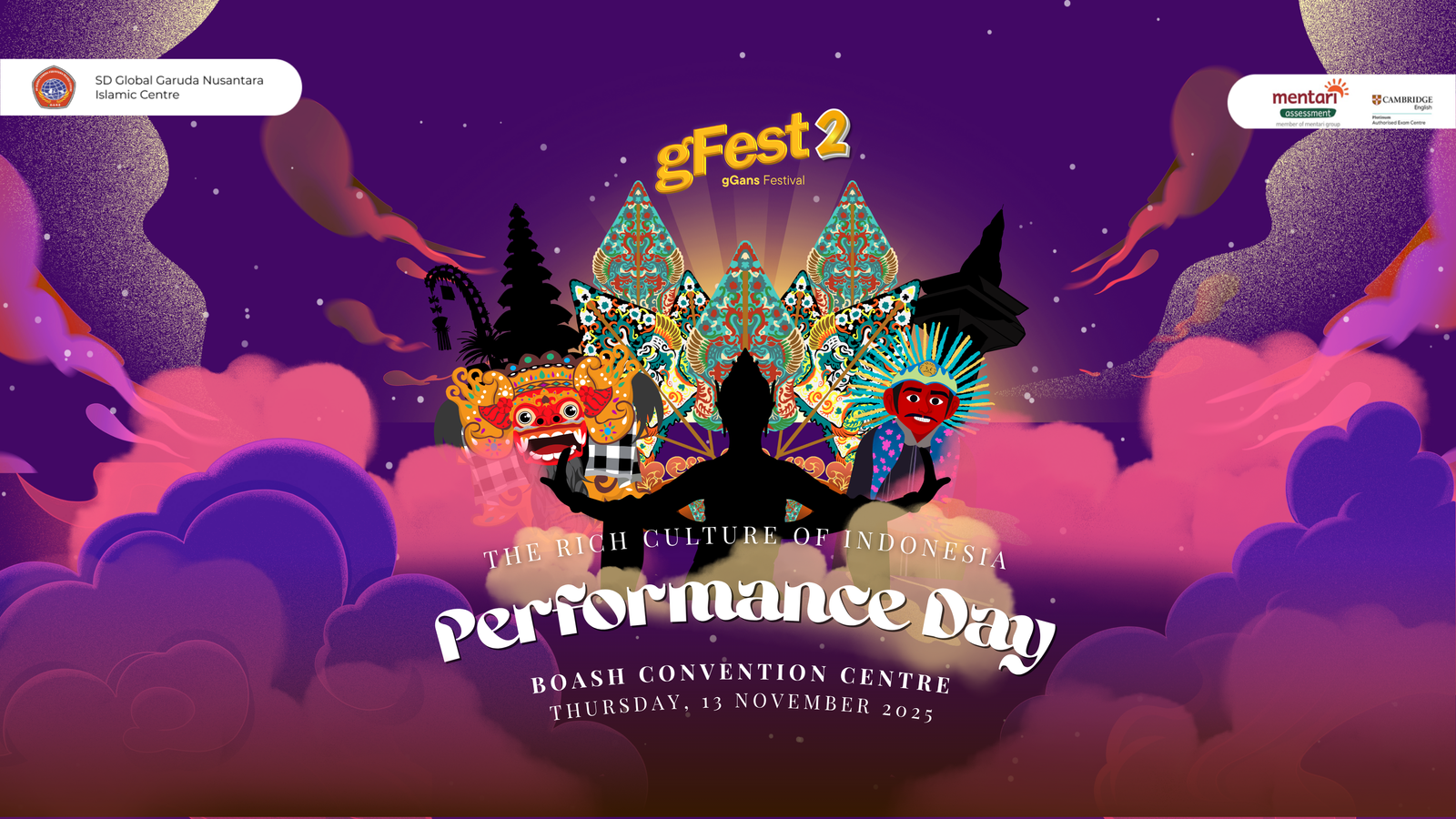 DAFTARgGans Festival (gFest) Festival merupakan cara ekspresif untuk merayakan warisan, budaya, dan tradisi yang dianggap penting untuk dirayakan. Hal tersebut memainkan peran penting untuk menambah struktur dalam kegiatan sosial dan seni. gGans Festival sesi 2 ini adalah pertunjukan karya seni yang diselenggarakan oleh SD Global Garuda Nusantara Islamic Centre yang didalamnya terdapat nilai-nilai religi dan pendidikan dan juga siraman rohani.